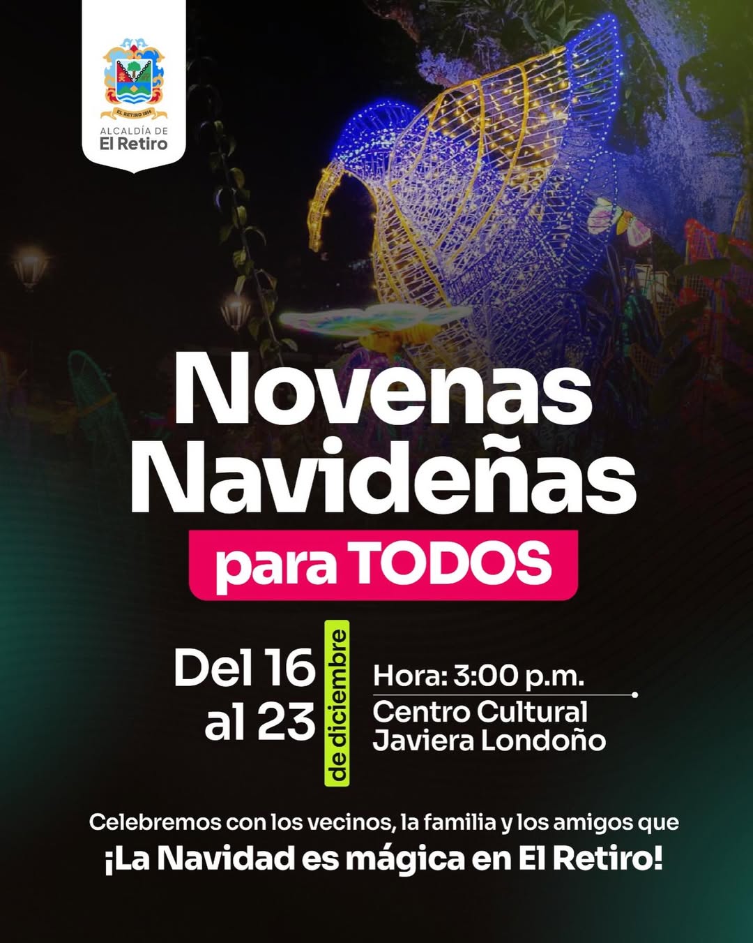 Novenas Navideñas para TODOS Del 16 al 23 de diciembre ⏰ 3:00 p. m. 📍 Centro Cultural Javiera Londoño Ven y celebremos juntos porque ¡La Navidad es mágica en El Retiro!