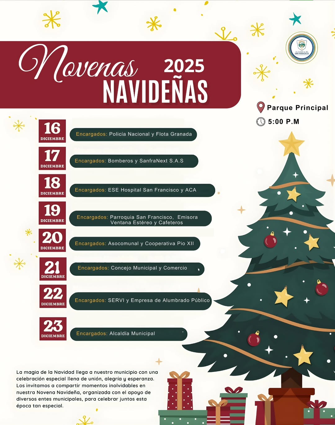La Navidad se celebra en comunidad, con fe, unión y esperanza. Desde el 16 hasta el 23 de diciembre, los invitamos a compartir cada noche un espacio de oración, encuentro y alegría en nuestras Novenas Navideñas, acompañados por las diferentes instituciones y organizaciones de nuestro municipio.