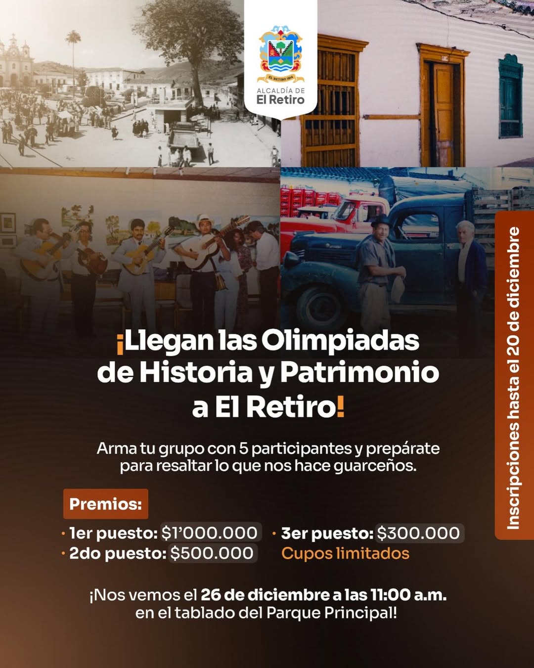 En el marco de las Fiestas de Los Negritos 2025… ¡Llegan las Olimpiadas de Historia y Patrimonio a El Retiro! Formá tu equipo con 5 participantes y prepárate para poner a