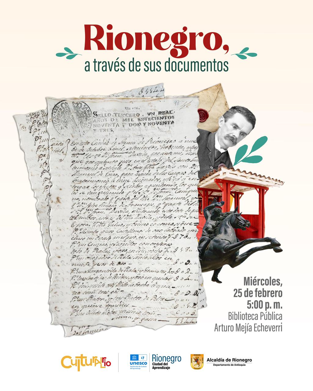 Este miércoles 25 de febrero a las 5:00 p. m., en la Biblioteca Pública Arturo Mejía Echeverri, abrimos un espacio para reencontrarnos con nuestra memoria en “Rionegro, a través de sus documentos”.