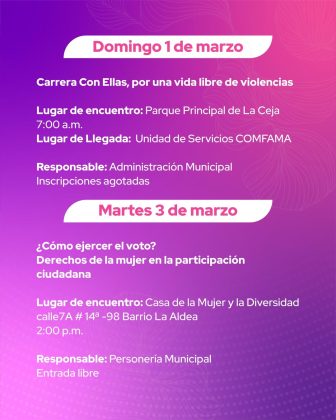En La Ceja vivimos el Mes de la Mujer con una programación especial para reconocer su fuerza, liderazgo y aporte a nuestro municipio. Tendremos actividades de bienestar y encuentro donde el