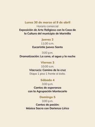 Disfruta algunos imperdibles: • Exposición de arte religioso (30 mar – 9 abr) Eucaristía Jueves Santo (2 abr – 11:00 a. m.) • Viacrucis (3 abr – 10:00 a. m.) • Cantos de esperanza (4 abr – 3:00 p. m.)