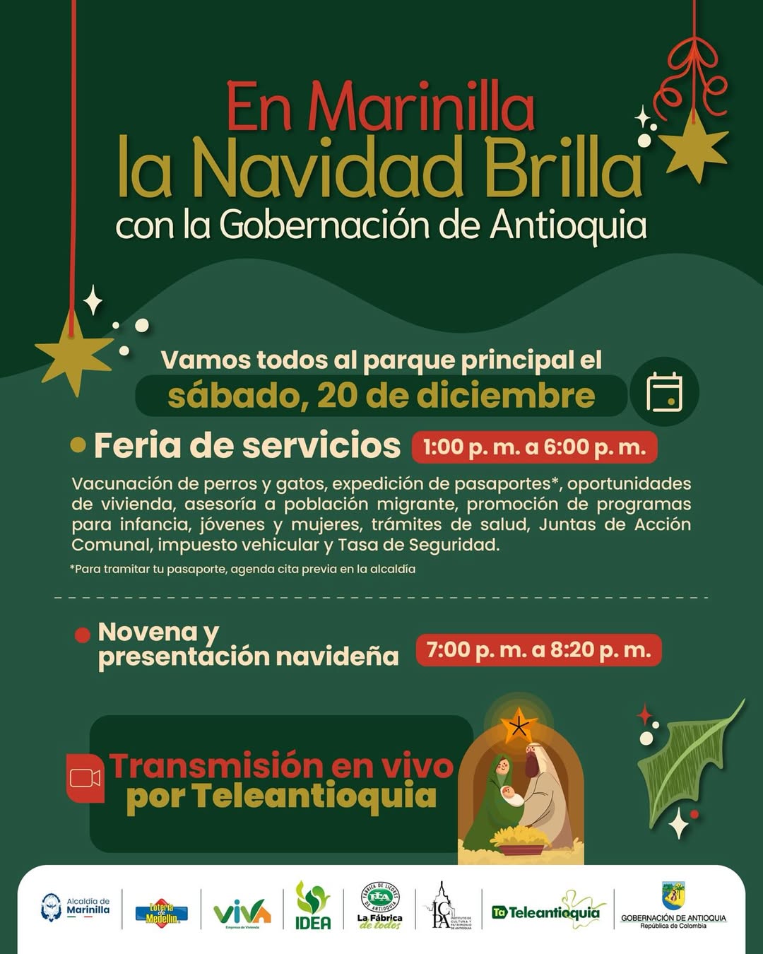 Este sábado 20 de diciembre te esperamos en el parque principal para disfrutar de una feria de servicios y la novena navideña. Ven con tu familia y celebremos juntos. ¡Te esperamos!