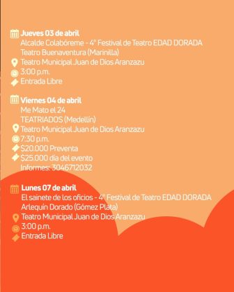 03ABR(ABR 3)12:0011(ABR 11)21:004to Festival Edad Dorada de Teatro de Adultos MayoresLa Ceja