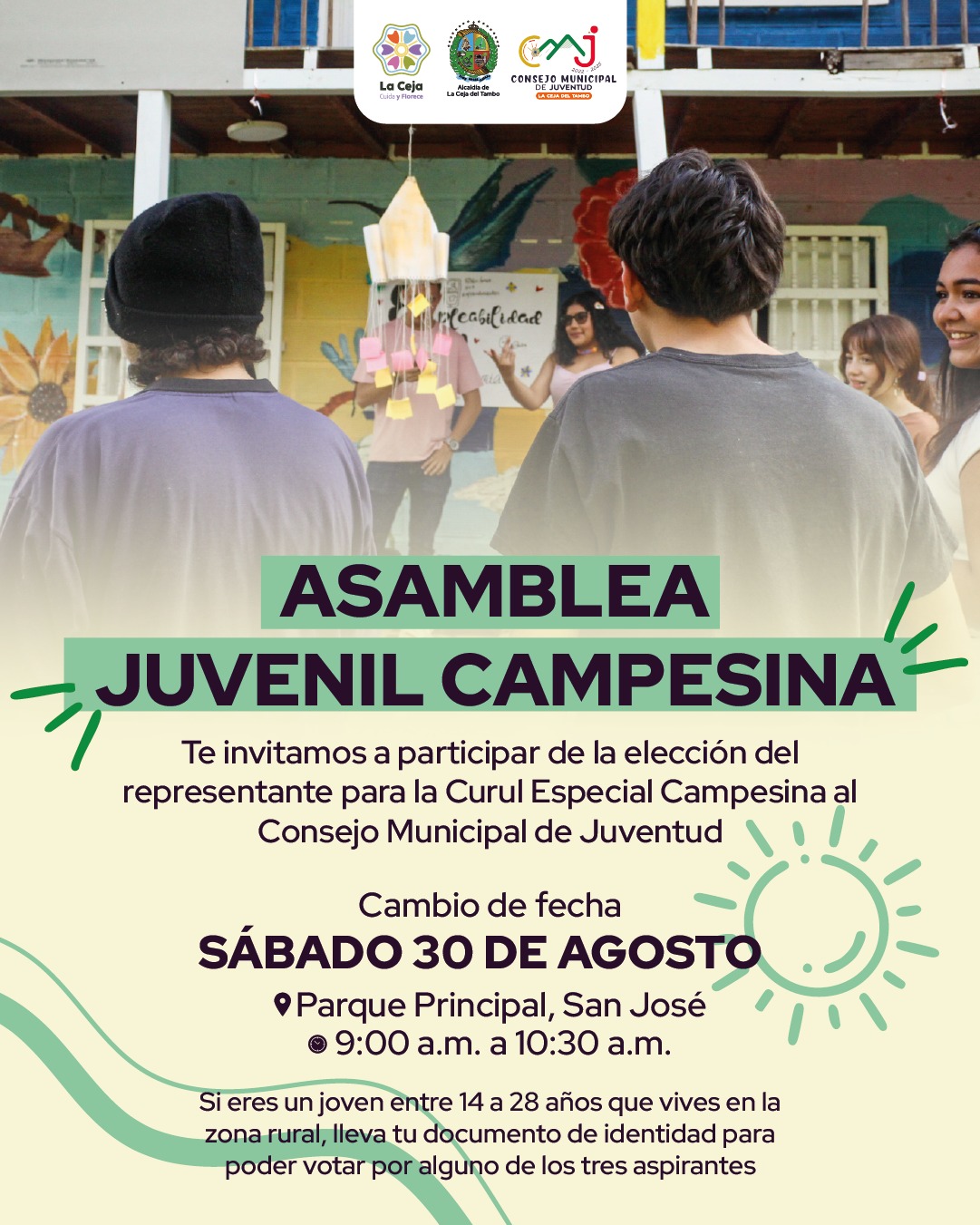 La Administración Municipal informa a la comunidad cejeña que, el próximo sábado 30 de agosto, en horas de la mañana, se llevará a cabo la Asamblea Juvenil Campesina para la elección del representante de la Curul Especial Campesina del Consejo Municipal de Juventud que se renovará y empezará funciones el próximo año, 2026.