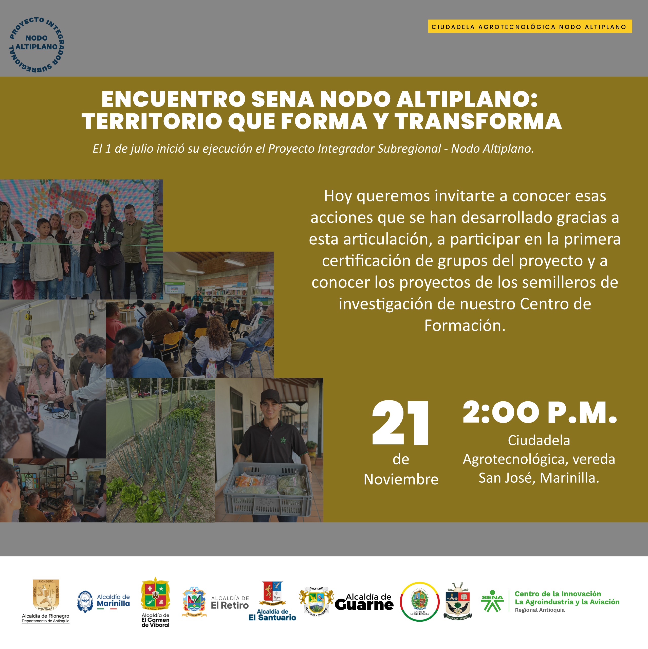 Desde el SENA Centro de la Innovación, la Agroindustria y la Aviación queremos invitarte al I Encuentro SENA Nodo Altiplano: Territorio que forma y transforma, donde presentaremos los avances del