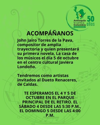 Los próximos 4 y 5 de octubre, el parque principal de El Retiro se llenará de bambucos, pasillos y ritmos tradicionales que han acompañado la memoria cultural del país por cinco décadas. El día de la final se le rendirá homenaje al compositor John Jairo Torres de la Pava, quien lanzará su libro La casa de los músicos en el Centro Cultural Javiera Londoño y durante la deliberación estará como grupo invitado el Dueto Renaceres de Manizales.