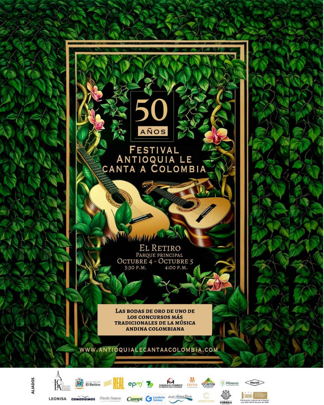 Llegamos a las Bodas de Oro con nuestro Festival, reuniendo a lo mejor de lo mejor de nuestra música tradicional. Parque Principal de El Retiro será el escenario de una celebración histórica: las Bodas de Oro del Festival Antioquia le Canta a Colombia. Este año contará con 22 participantes, de toda la región andina colombiana, como Cundinamarca, Valle del Cauca, Risaralda, Caldas, Santander, Huila, Tolima, Boyacá y Antioquia.