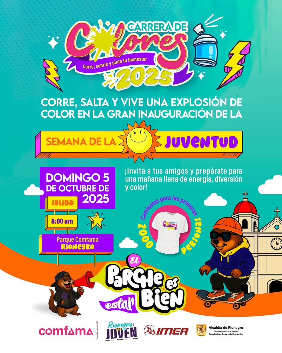 ¡La Semana de la Juventud comienza celebrando la vida y el bienestar! Este domingo 5 de octubre el Parque Comfama Rionegro se llenará de color con la Carrera de Colores 2025. Corre,