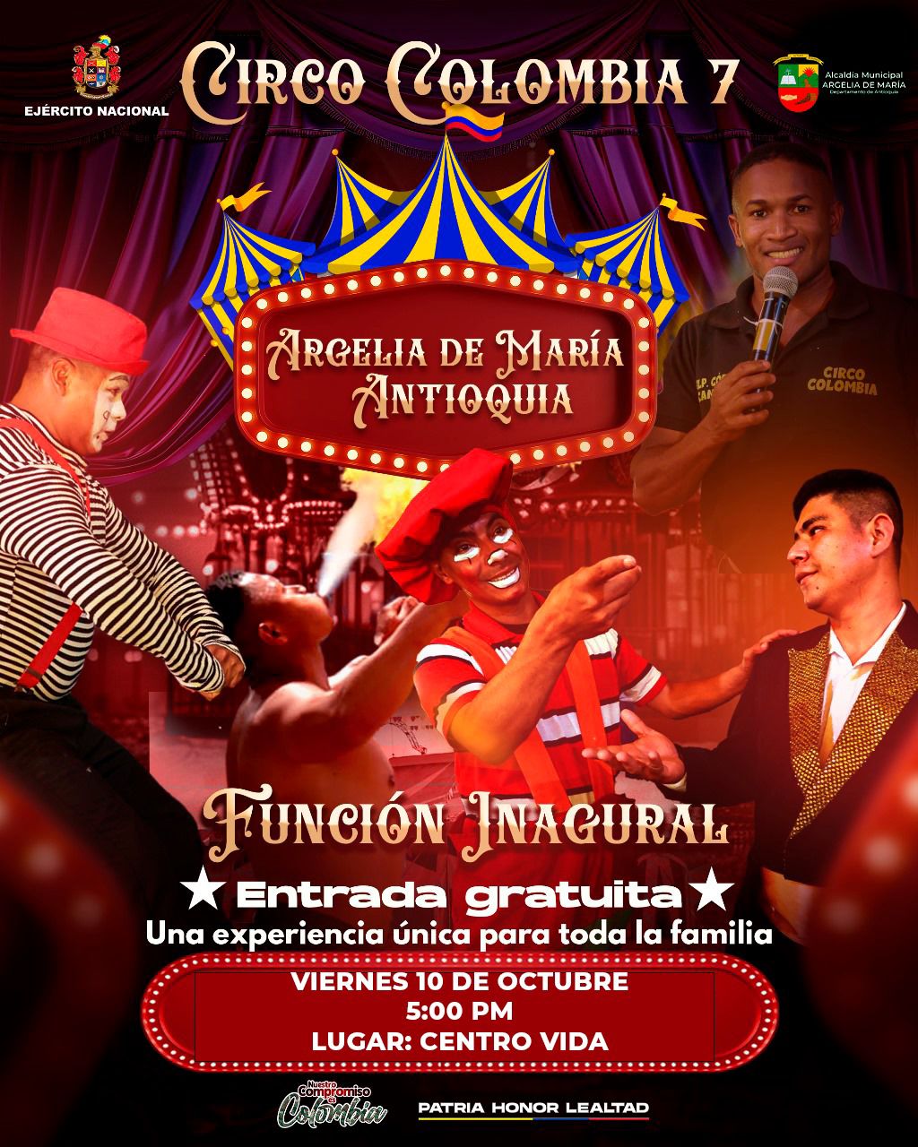¡La magia del circo llega a Argelia! El Ejército Nacional presenta con orgullo la primera función del Circo Colombia 7, un espectáculo lleno de alegría, acrobacias, música y sonrisas para toda