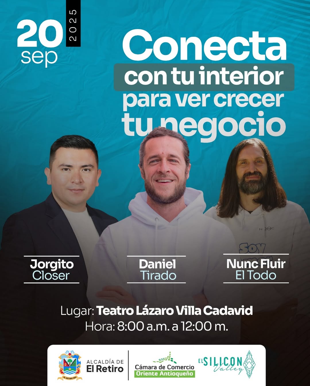 Este 20 de septiembre vive una experiencia transformadora en el Teatro Lázaro Villa Cadavid (El Retiro) junto a Daniel Tirado, Jorgito Closer y Nunc Fluir, quienes compartirán herramientas únicas para potenciar tu vida y tu empresa.