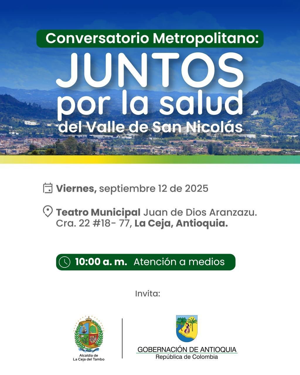 Queremos invitarte a ser parte del *Conversatorio Metropolitano: Juntos por la salud del Valle de San Nicolás*, que tendrá lugar el próximo viernes en el municipio de La Ceja.