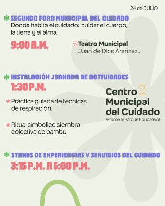 * Segundo Foro Municipal del Cuidado: A partir de las 9:00 a. m. en el Teatro Municipal, se realizará un espacio de reflexión sobre el papel de los sistemas de cuidado en el desarrollo humano y social de los territorios, el envejecimiento activo y la función social del cuidado. Será una jornada de conversación, aprendizaje y construcción colectiva.