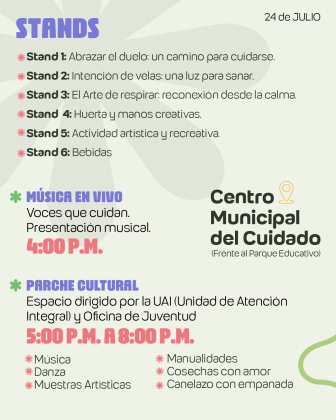 * Jornada de experiencias y servicios del cuidado: Desde la 1:30 p. m., en el Centro del Cuidado (frente al Parque Educativo), se compartirán experiencias significativas, se reconocerá la entrega silenciosa de quienes cuidan y se ofrecerá una amplia oferta de servicios pensados para su bienestar. Una tarde para honrar el amor, la dedicación y la transformación que representa el acto de cuidar.