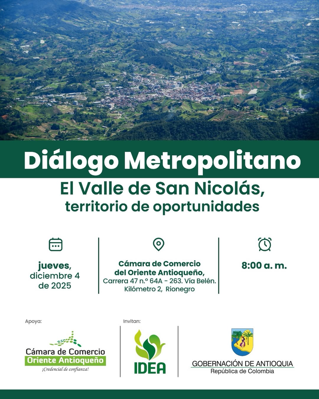 La gobernación de Antioquía y el Instituto para el Desarrollo de Antioquía IDEA, con el apoyo de la Cámara de Comercio Oriente Antioqueño están invitado a participar en un Diálogo Metropolitano para conocer de primera mano porque el Valle de San Nicolás es un territorio de oportunidades.