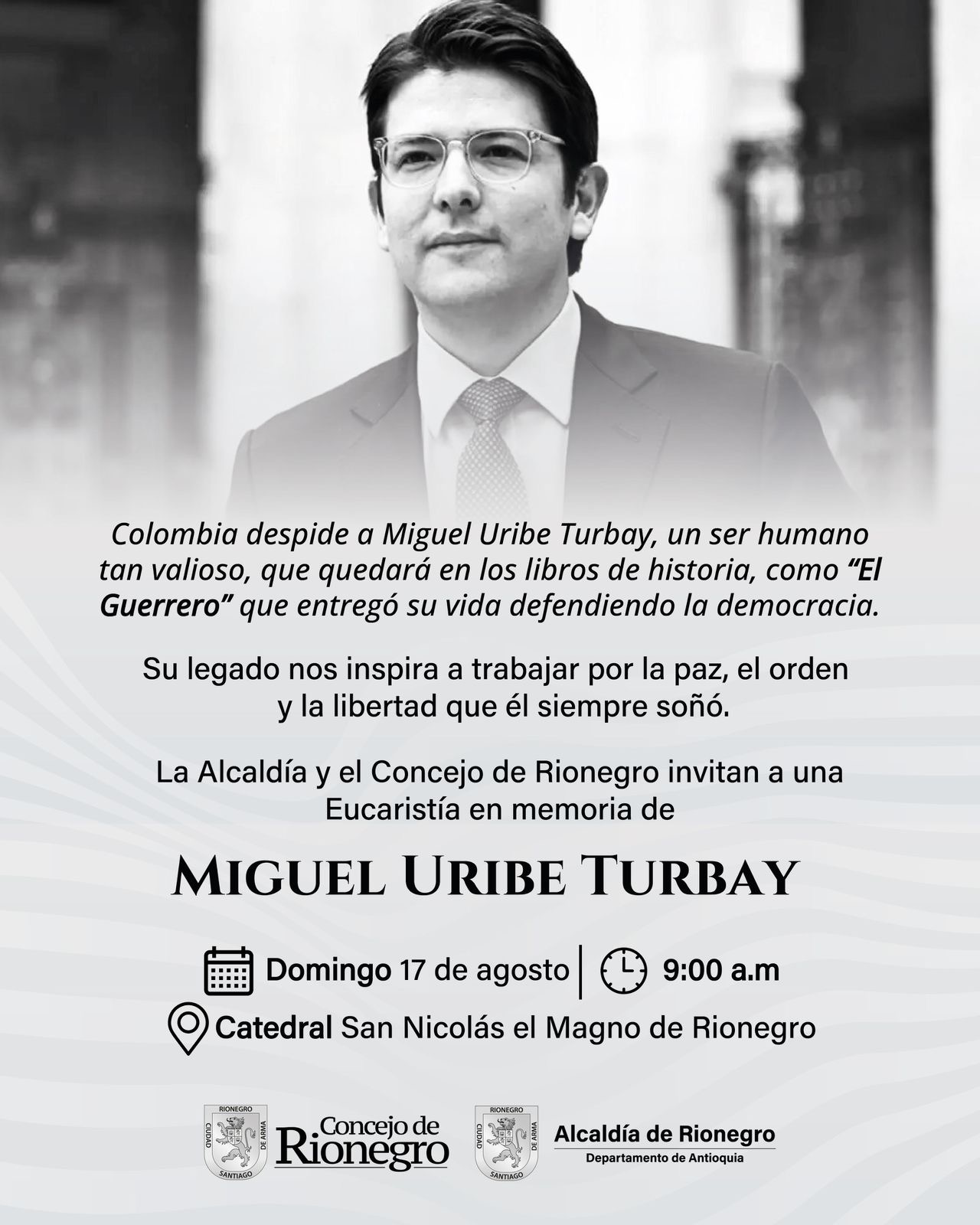 La Alcaldía de Rionegro y el Concejo Municipal, los invitan a la Eucaristía en memoria de MIGUEL URIBE TURBAY