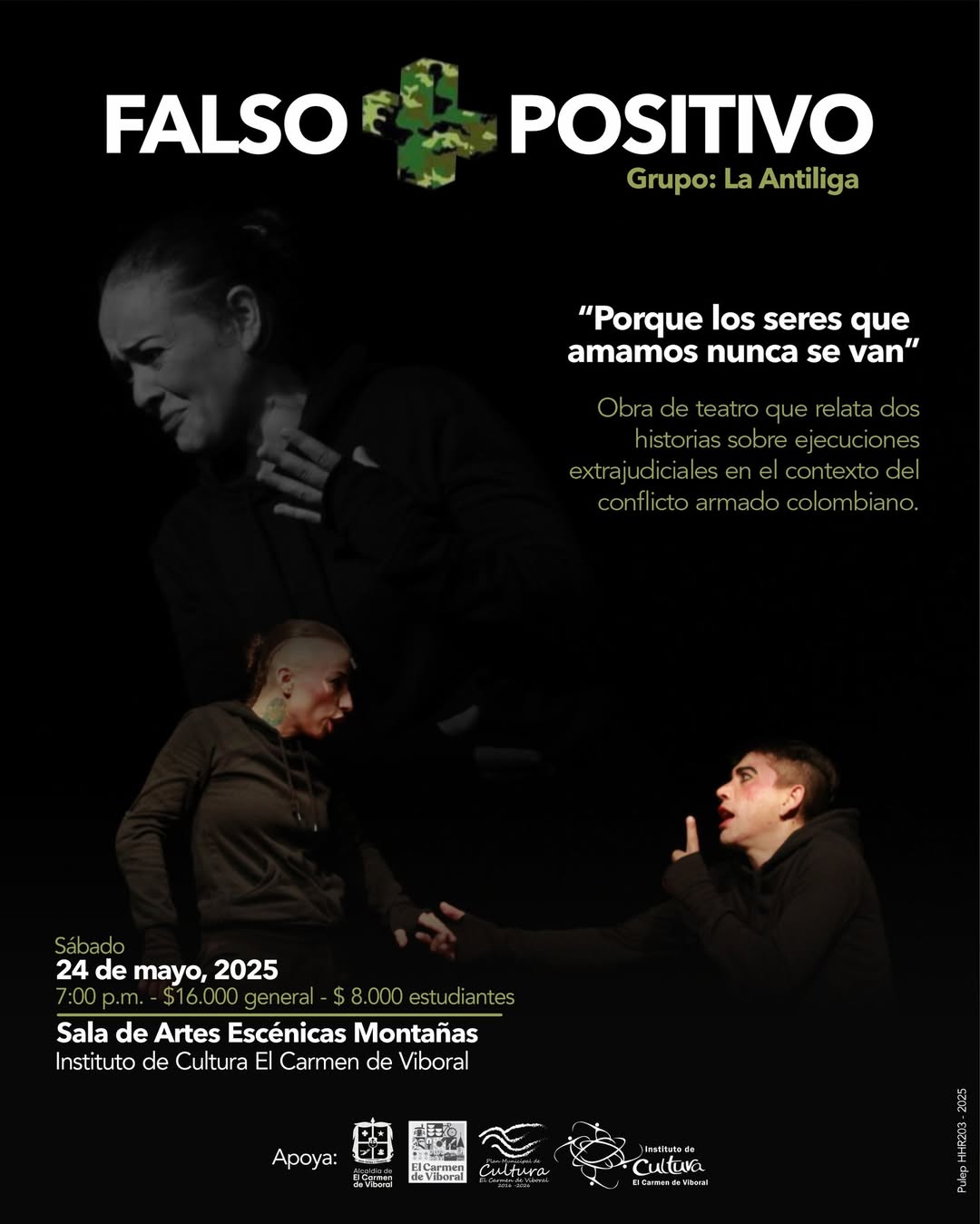 Extendemos la invitación del grupo de teatro La Antiliga, quienes estarán presentando su obra «Falso positivo» en la Sala Montañas del Instituto de Cultura.