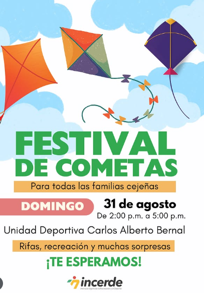 Este domingo 31 de agosto te invitamos al Festival de Cometas del Incerde, en la Unidad Deportiva Carlos Alberto Bernal.