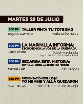 27JUL(JUL 27)08:0002AGO(AGO 2)20:00Fiesta del Libro en MarinillaMarinilla