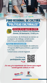 Foro Regional de Cultura – “Políticas Culturales” 📍 El Santuario, Antioquia 📅 Viernes 29 de agosto de 2025 🕒 3:00 p.m. – Casa de la Cultura Luis Norberto Gómez 💬 Los municipios de Antioquia