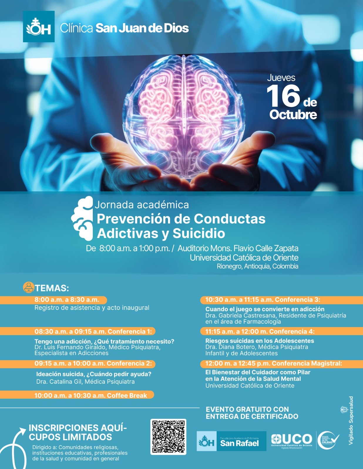 La Clínica San Juan de Dios de La Ceja, en alianza con la Universidad Católica de Oriente (UCO), invita a medios de comunicación, instituciones educativas, profesionales de la salud, comunidades religiosas, familias y comunidad en general a participar de la Jornada Académica de Prevención de Conductas Adictivas y Suicidio, que tendrá lugar el próximo jueves 16 de octubre a partir de las 7:30 a.m., en el Auditorio Mons. Flavio Calle Zapata de la UCO, el evento será de entrada gratuita y certificada, con previa inscripción.