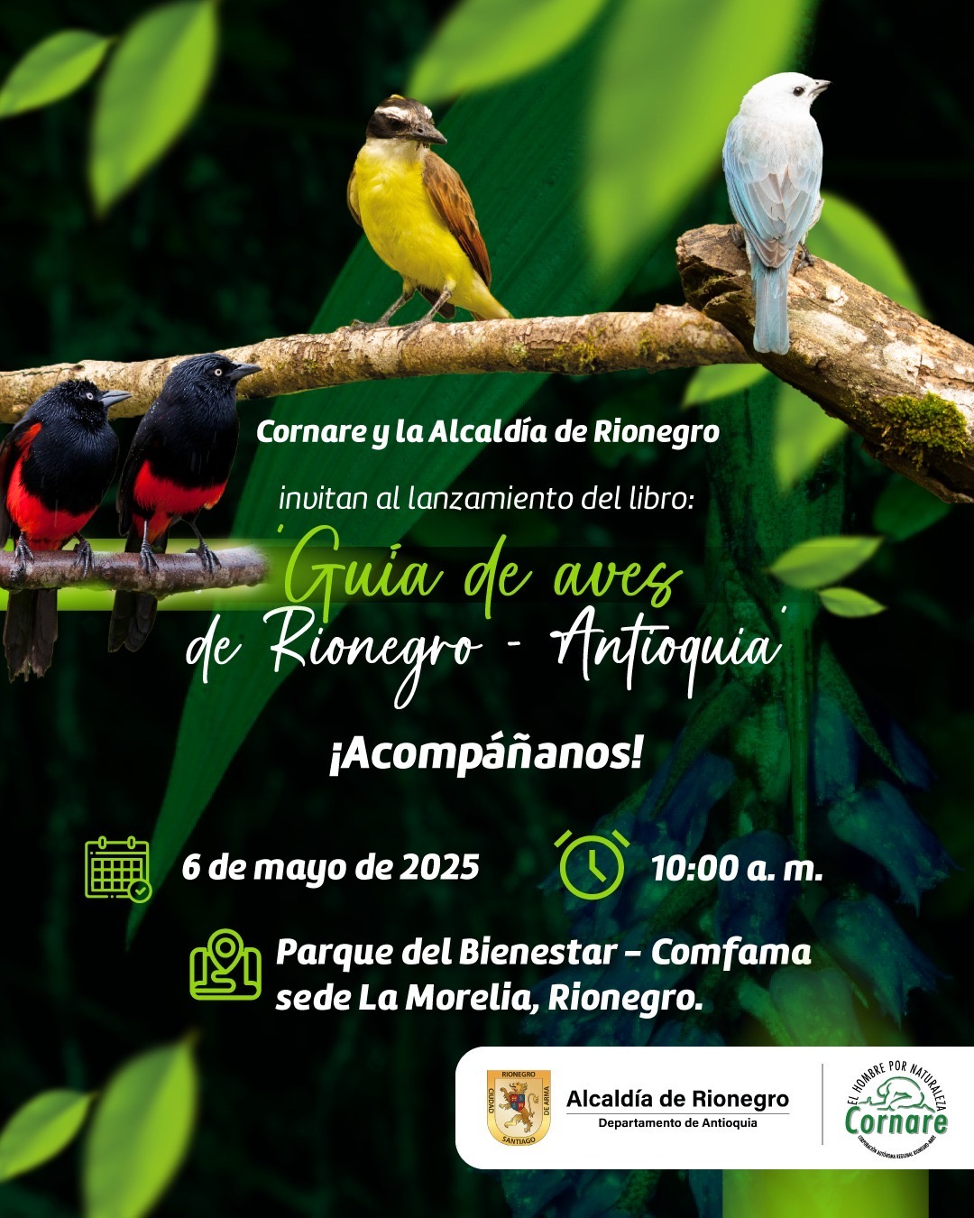 Desde Cornare y la Alcaldía de Rionegro se invita al lanzamiento del libro *Guía de Aves de Rionegro – Antioquia*.