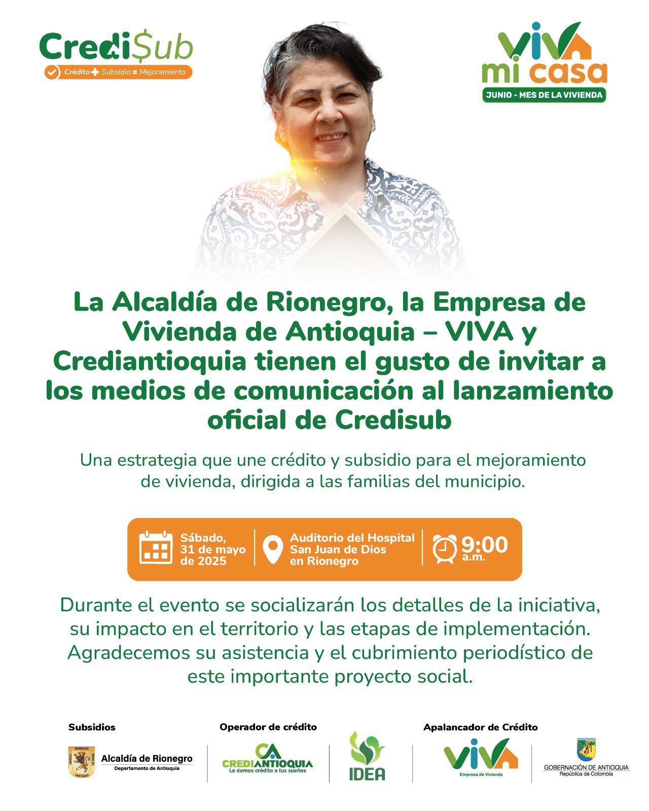 La Alcaldía de Rionegro, la Empresa de Vivienda de Antioquia – VIVA y Crediantioquia tienen el gusto de invitarlos al lanzamiento oficial de Credisub, una estrategia que une crédito y subsidio para el mejoramiento de vivienda y el mes de la Vivienda.