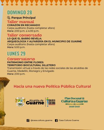 Prepárate para vivir una agenda llena de recorridos, conversatorios, talleres y encuentros que exaltan los saberes y prácticas que hacen de Guarne un territorio de raíces vivas.