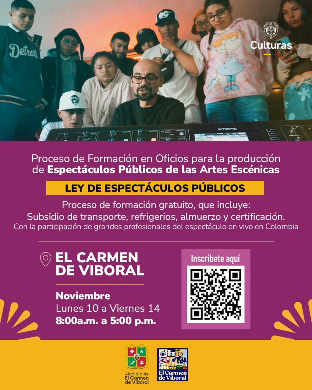 Este proceso es organizado por el Ministerio de las Culturas, las Artes y los Saberes, con el apoyo del Ministerio de la Igualdad, y se llevará a cabo desde el próximo lunes 10 de Noviembre al viernes 14 de noviembre de 2025, de 8:00 a.m. a 5:00 p.m., En el Municipio de El Carmen de Viboral