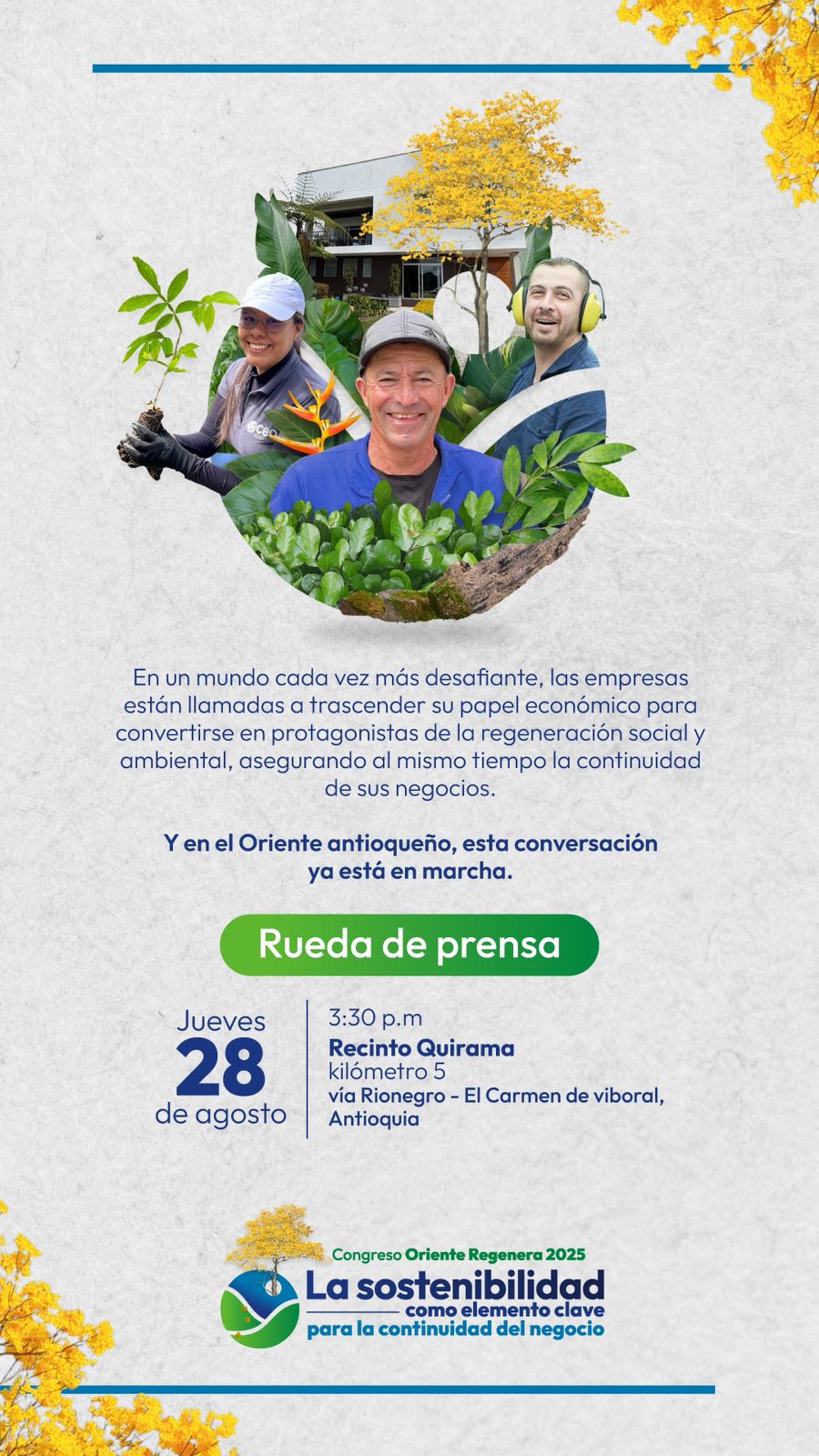 Será el escenario para presentar los detalles de este encuentro empresarial que abrirá la conversación sobre sostenibilidad y continuidad del negocio en el Oriente antioqueño, reuniendo a directivos, líderes de sostenibilidad, expertos en gestión del riesgo, academia, instituciones y sector público en torno a la construcción de modelos empresariales con enfoque regenerativo.