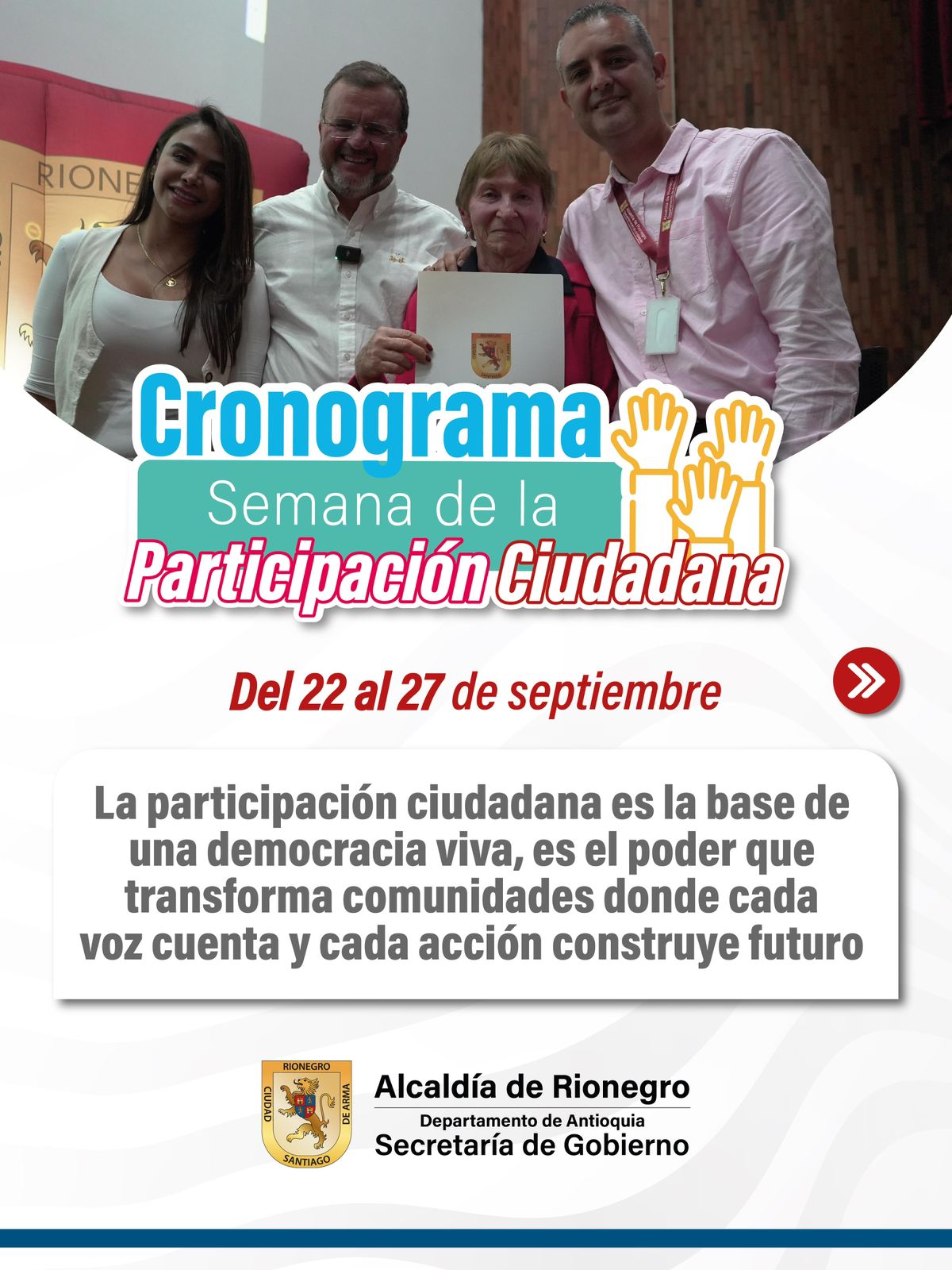 Del 22 al 27 de septiembre, la Alcaldía de Rionegro invita a toda la comunidad a ser parte activa de la Semana de la Participación Ciudadana, una iniciativa que busca fortalecer los lazos entre las instituciones y los habitantes, reafirmando el compromiso con una democracia viva, cercana y transparente.