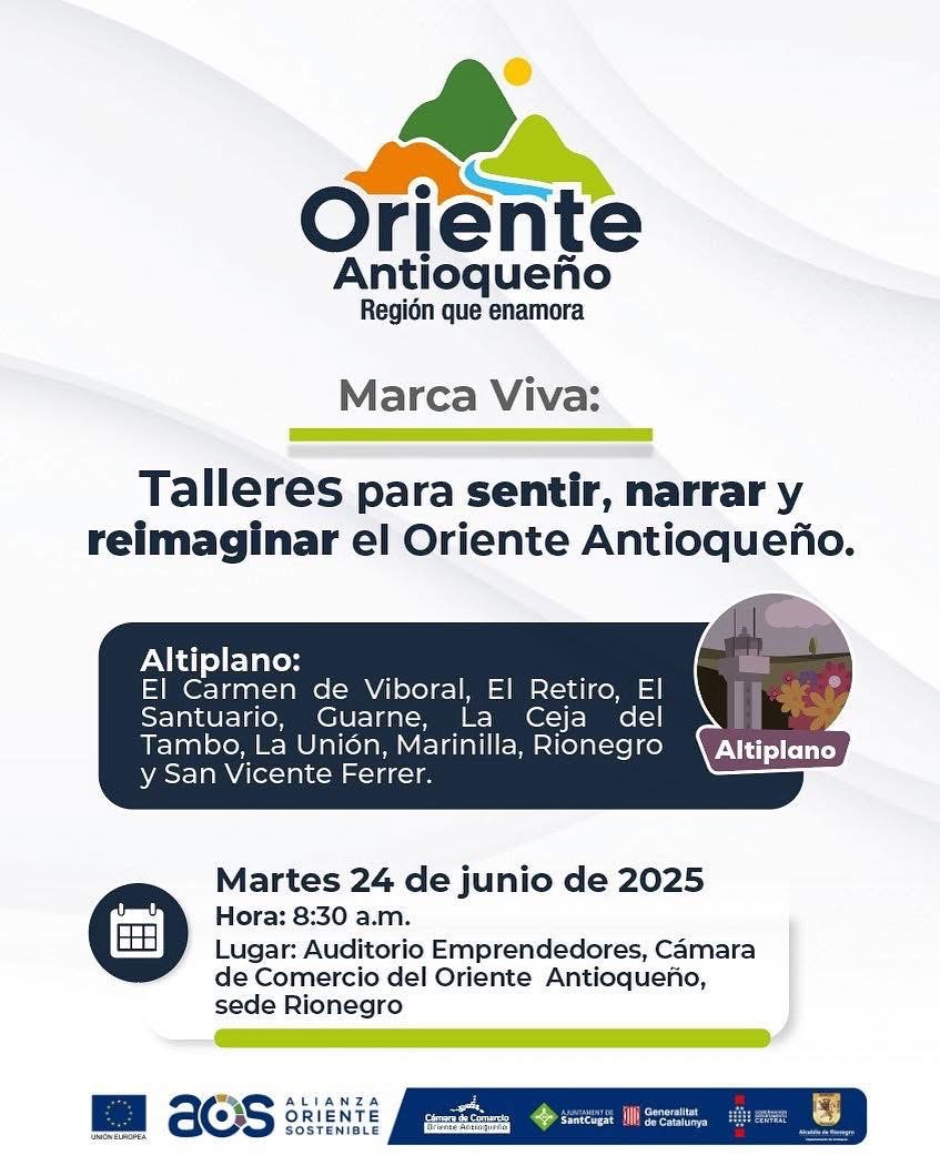 .Te invitamos a ser parte de la marca territorial «Oriente Antioqueño, región que enamora», por medio de un taller diseñado para que los empresarios, líderes del turismo, instituciones y ciudadanos del Altiplano del Oriente Antioqueño se conecten con la esencia de nuestra región y construyan desde sus voces la narrativa de una marca que nos represente a todos.