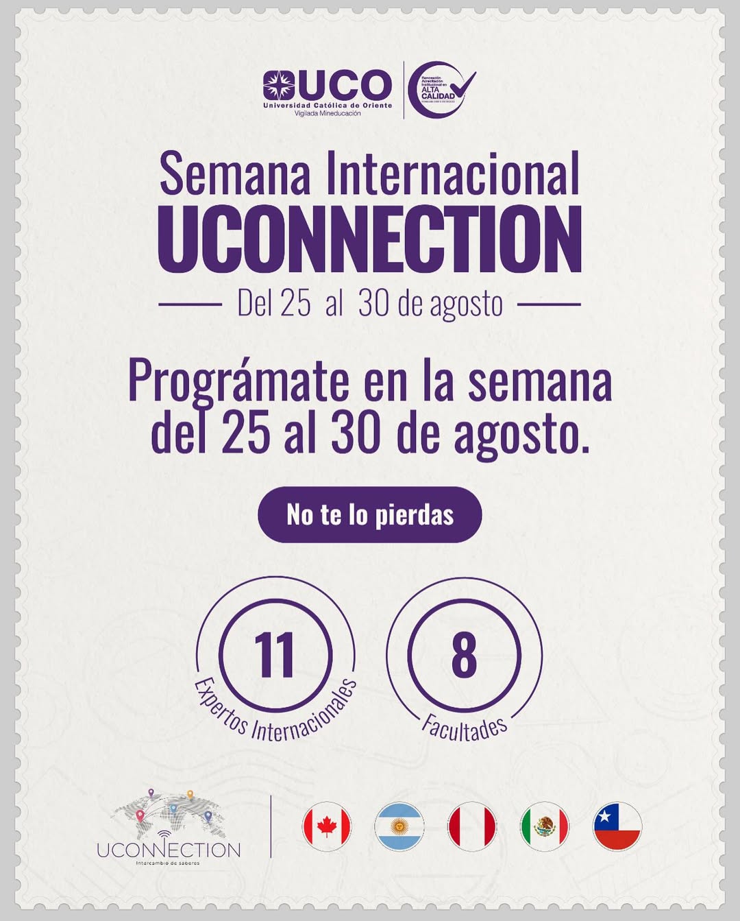 Oficialmente estamos a días de la Semana Internacional UCONNECTION 2025, un espacio único para compartir, aprender y vivir el intercambio de saberes con 11 expertos internacionales y la participación de nuestras 8 facultades.