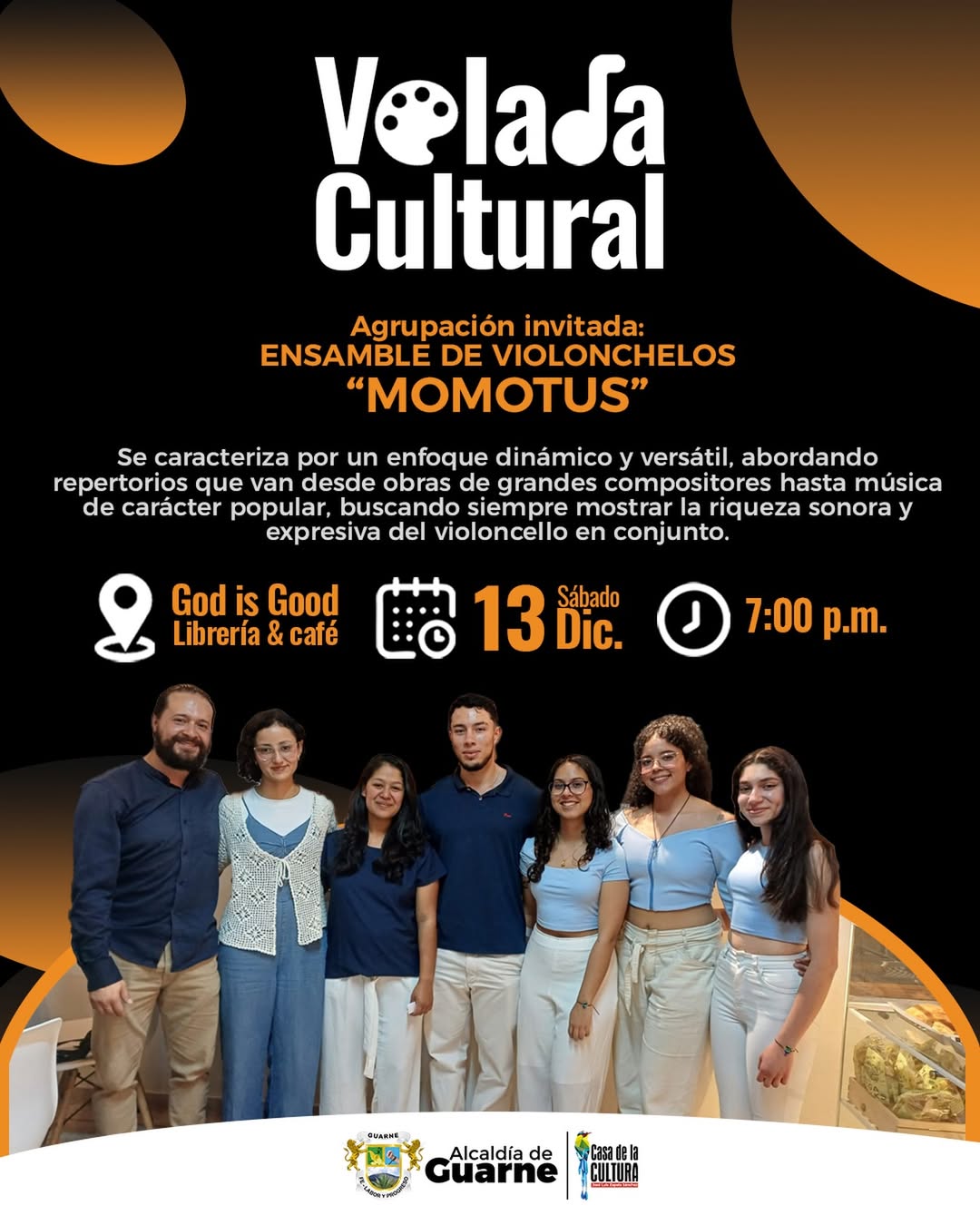 En nuestra VELADA CULTURAL recibimos al Ensamble de Violonchelos MOMOTUS, una agrupación nacida en 2024 e integrada por talentosos estudiantes del taller de violoncello de la Escuela de Música de la Casa de la Cultura José Luis Zapata Sánchez.