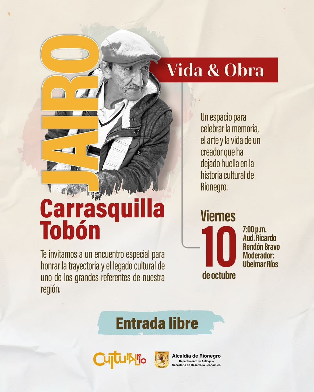 Este viernes 10 de octubre, acompáñanos en un encuentro entrañable para rendir homenaje a Jairo Carrasquilla Tobón, un referente invaluable de nuestra región, cuya obra sigue iluminando la identidad y el corazón de nuestra comunidad.