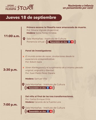 Ya está disponible la programación del Vigésimo Foro Anual de Filosofía STOA. Nacimiento e infancia: un pensamiento por venir. Tendremos ponencias y presentaciones artísticas durante cuatro días, con el propósito de