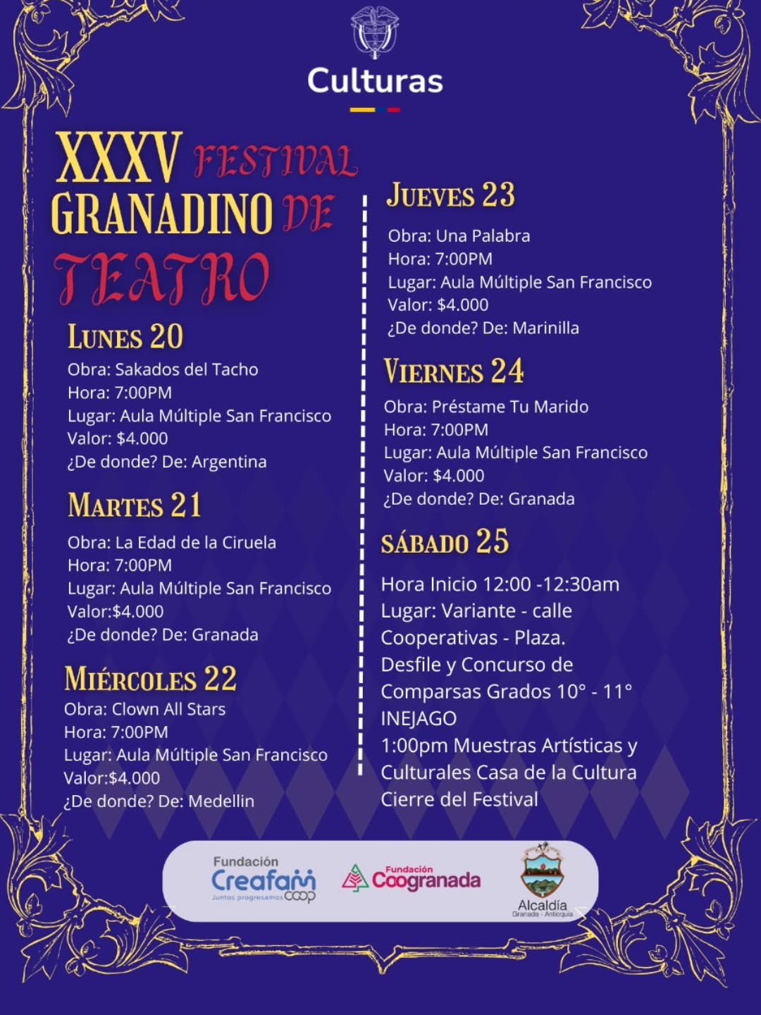 Desde hoy compartimos la cartelera oficial del XXXV Festival Granadino de Teatro, un evento lleno de arte, talento y cultura que nos enorgullece como municipio.